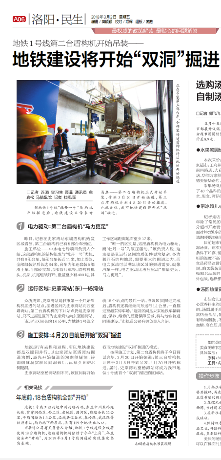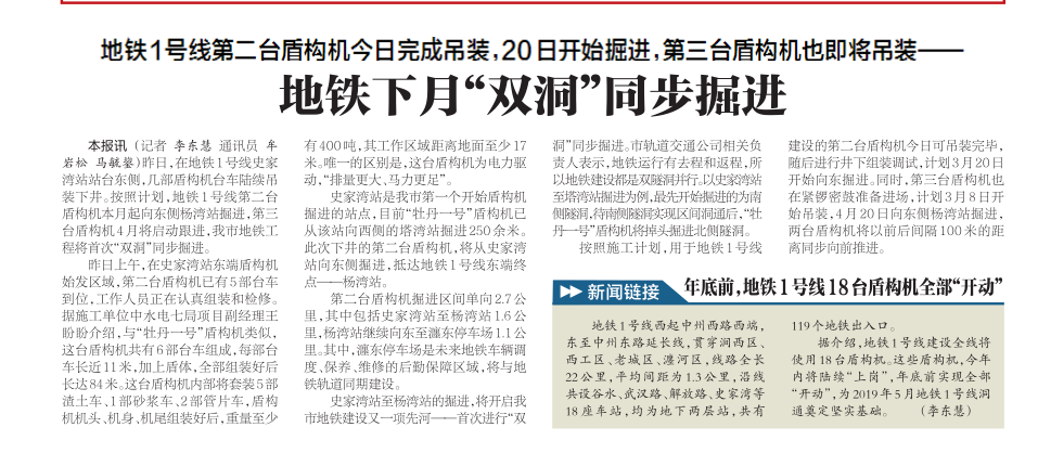 我市地铁1号线建设新进展再受媒体关注:第二台盾构机已于2018年2月27日在史家湾站东端左线吊装下井,计划3月2日完成吊装,3月中旬具备从史家湾站左线向杨湾站始发掘进条件。第三台盾构机计划3月上旬在史家湾站东端右线吊装下井,4月份具备从史家湾站右线向杨湾站始发掘进条件,届时史家湾站至杨湾站盾构区间将成为我市首个实现双线同时掘进的盾构区间,这两台盾构机的先后投入,也将大幅提升1号线盾构区间作业速度。