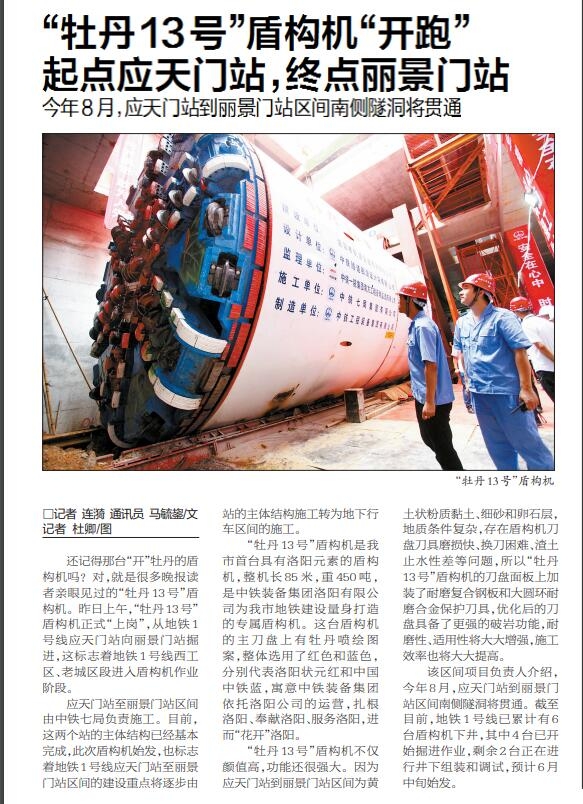 5月29日,“牡丹13号”盾构机在1号线应天门站始发,向丽景门站掘进。