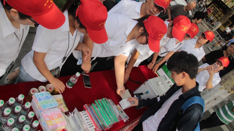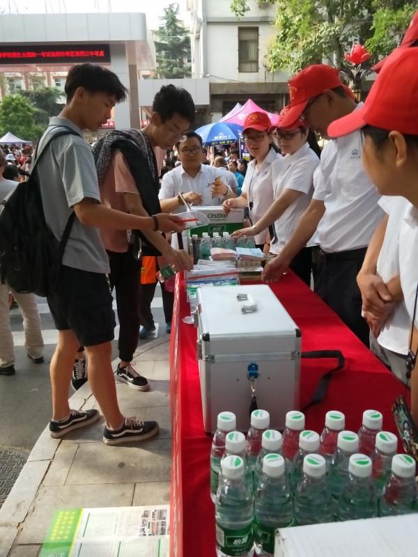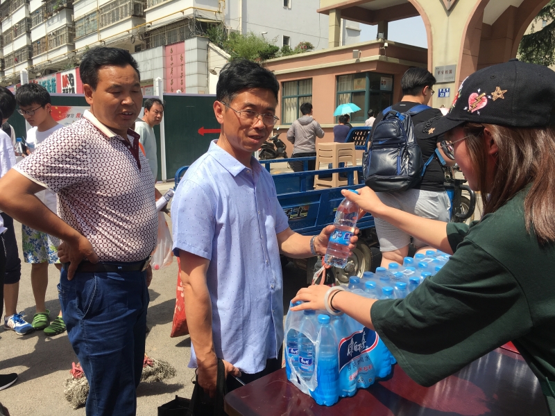 央企铁军助力高考,绵薄之力,无上光荣。在市二十六中考点,中铁十六局志愿者开展为考生家长送清凉活动。