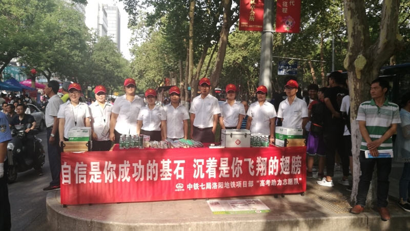 “自信是你成功的基石,沉着是你飞翔的翅膀”。在市三中考点,中铁七局的助考志愿者们打出这样的横幅为考生加油,并在开考前免费给考生发放铅笔、橡皮等文具及饮用水等降温用品。值得注意的是,中铁七局项目部在高考前3天,专门召开噪音污染防治工作部署会,进一步加强高考期间建设现场的噪声污染控制,努力为考生创造一个安、舒心的考试环境。