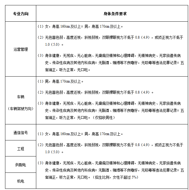 (一)色盲、色弱考生慎重报考。因轨道交通行业的特殊性,公司在录用订单班毕业生时对身体条件有严格的要求,毕业生不得有色觉功能异常,请色盲、色弱考生慎重报名。