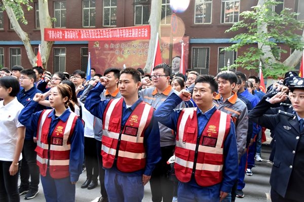 4月29日上午9:00,共青团洛阳市委,为纪念五四运动100周年,继承和弘扬以爱国主义为核心的伟大民族精神,以“爱国、进步、民主、科学”为核心的五四精神、以“亲民爱民、艰苦奋斗、科学求实、迎难而上、无私奉献”为核心的焦裕禄精神,组织洛阳市轨道交通集团及地方单位、企业、学校、医院共计9个青年方阵约280余人齐聚中信重工焦裕禄事迹展览馆举行“青春心向党•建功新时代”特别主题团日活动。