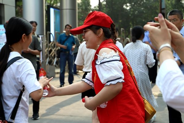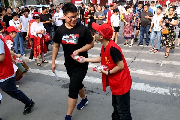 活动当日,志愿者们一大早便分别来到洛阳市第一中学、洛阳市第八中学和洛阳市第二十六中学考点,搭建服务站场地,摆放方凳,为考生和陪考家长准备休息纳凉的好去处,并贴心准备了矿泉水、藿香正气水、文具袋等用品。当考生来到考场,迎接他们的,是志愿者们一张张写满祝福的笑脸,一处纳凉地、一个歇脚处、一瓶水、一支笔、一块橡皮...给广大考生及家长提供的不仅仅是一分便利,更是精神上的鼓舞。此外,志愿者还为考场附近顶着烈日坚守岗位的交警同志送去了饮用水、藿香正气水等防暑降温物品。考试一结束,志愿者们立即将一瓶瓶满载着爱心与祝福的矿泉水送到从考场走出来的考生手中,让他们感受到社会大家庭的关爱。看着一个个考生脸上洋溢着幸福的微笑,听着一句句亲切的“谢谢”,顶着炎炎烈日的志愿者心中都是甜丝丝的。
