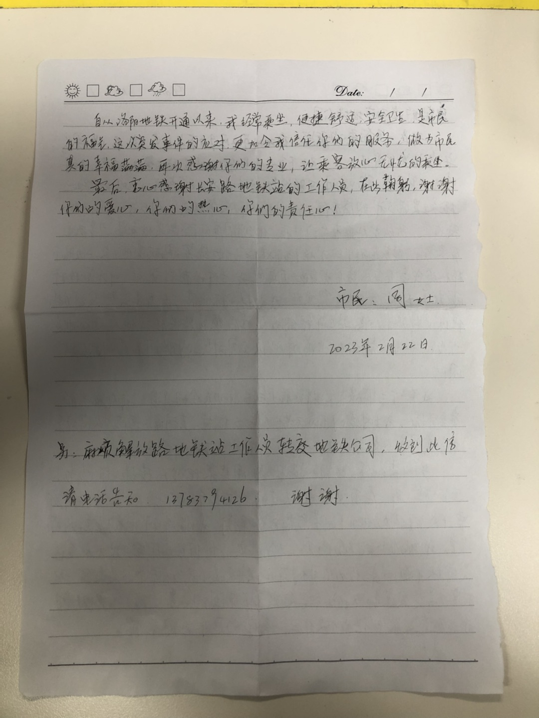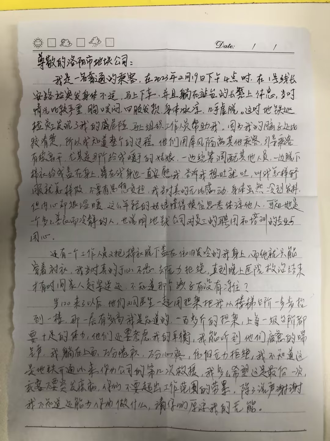乘客转至医院后经治疗身体渐为好转,当晚委托家人送还衣物,并于2月23日到解放路站客服中心送上信件以表感谢。
